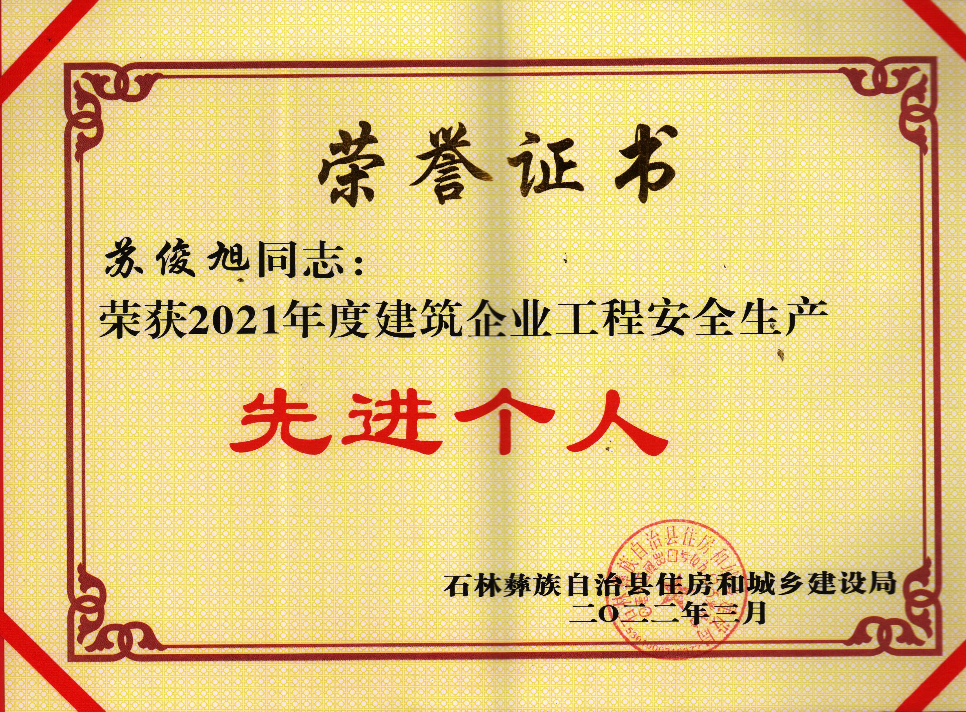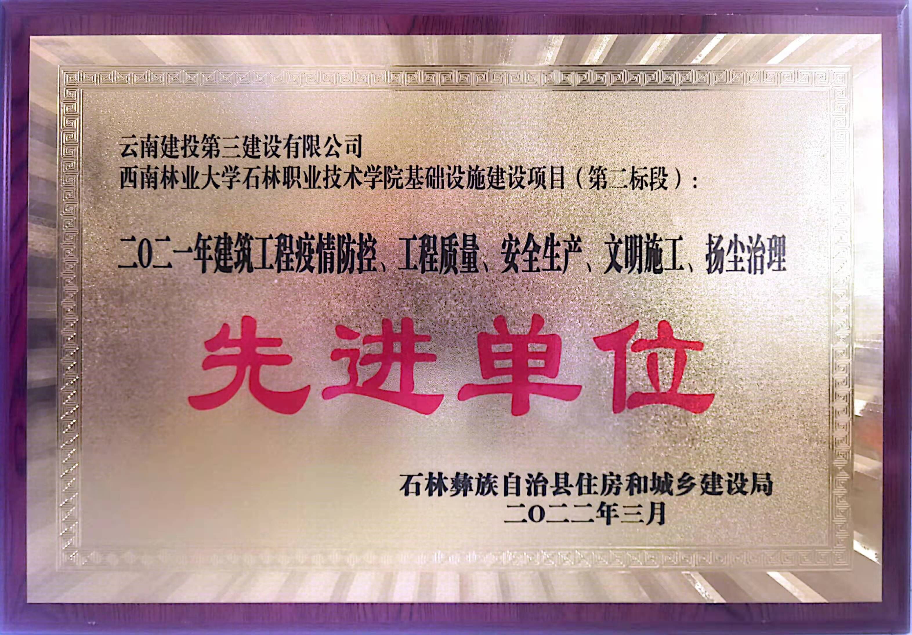 會上,萬勇通報表彰石林縣建筑施工領域2021年度安全生產文明施工和揚塵防控優(yōu)秀單位及優(yōu)秀先進個人。其中由第三項目經理部承建的西南林業(yè)大學石林職業(yè)技術學院基礎設施建設項目(第二標段)榮獲2021年建筑工程疫情防控、工程質量、安全生產、文明施工、揚塵治理先進單位,鄧仕貴榮獲2021年度昆明市建筑企業(yè)優(yōu)秀項目經理,李明榮獲2021年度建筑企業(yè)優(yōu)秀項目經理,蘇俊旭和趙紫峰榮獲2021年度建筑企業(yè)工程安全生產先進個人獎。