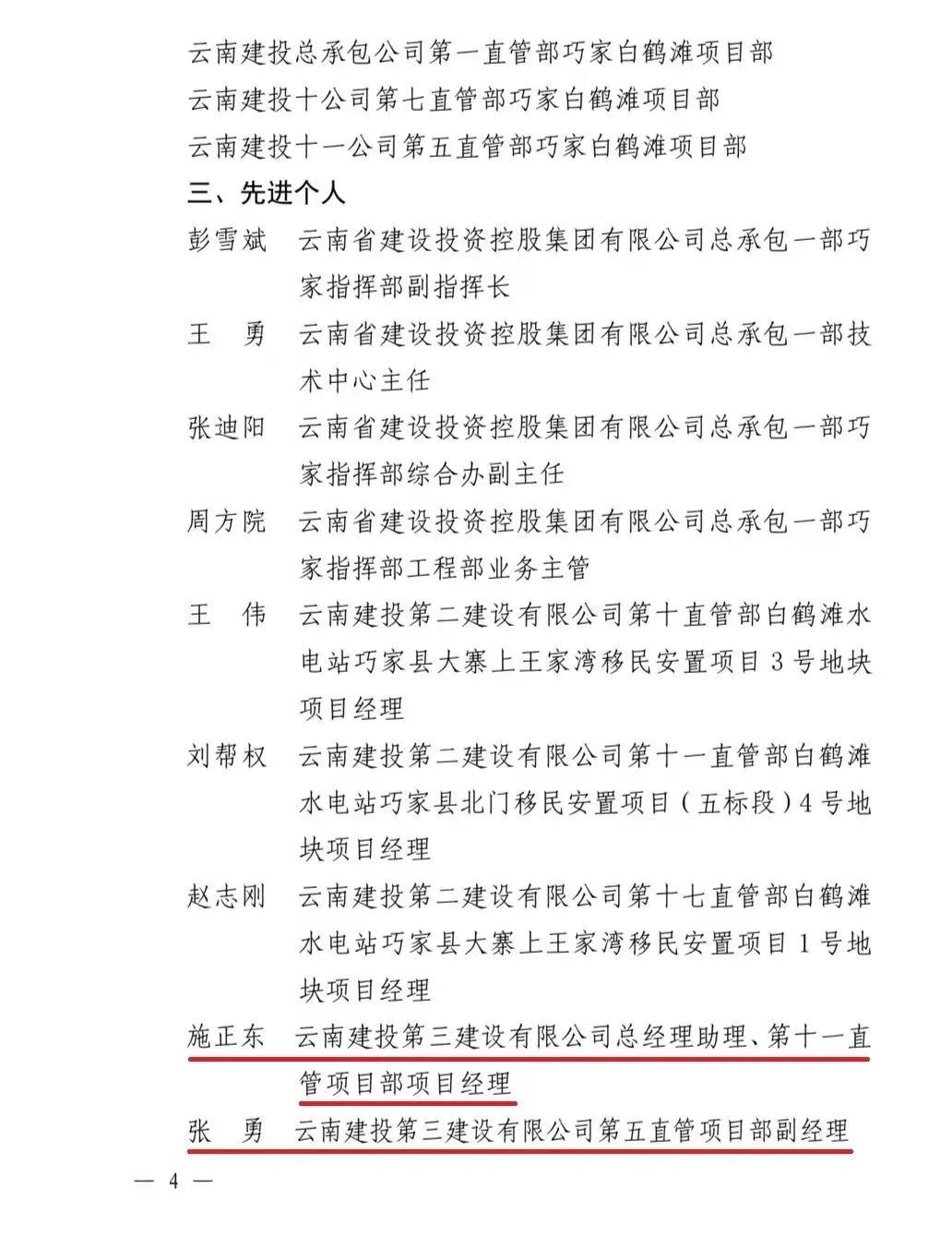 近日,云南省總工會和云南省建設投資控股集團有限公司聯合發文,通報表揚金沙江白鶴灘移民工程勞動競賽先進單位、先進集體及先進個人。公司第八直管項目部榮獲先進集體,公司總經理助理、第十一直管項目部經理施正東,第五直管項目部副經理張勇以及第三直管項目部項目經理何明亮榮獲先進個人。