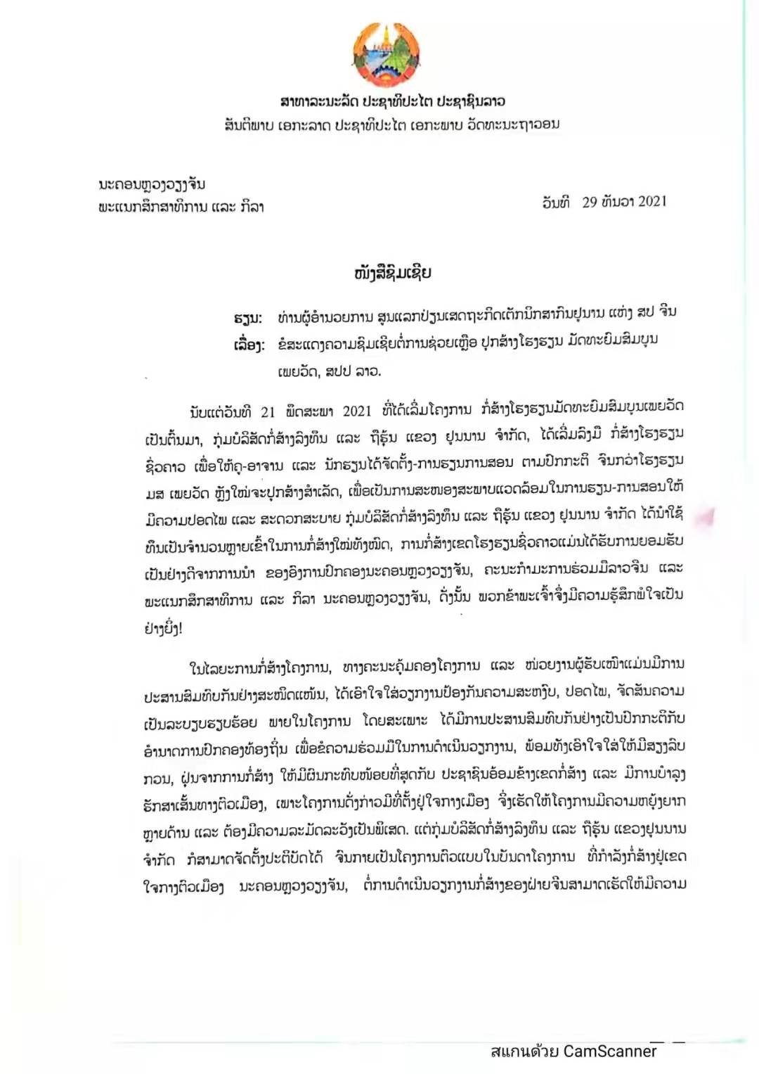 老中合作委員會寫給集團的感謝信中提到,援老撾萬象市皮瓦中學項目為中國援老10所學校的重點項目之一,多次受到萬象市政府表揚。面對世界百年之大變局和突發疫情,集團始終踐行老中命運共同體建設精神,為老撾的基礎設施建設和經濟發展貢獻智慧和力量。老中合作委員會向集團的突出貢獻表示感謝,對集團作為深刻踐行老中命運共同體精神的典范表示贊賞和堅定支持。