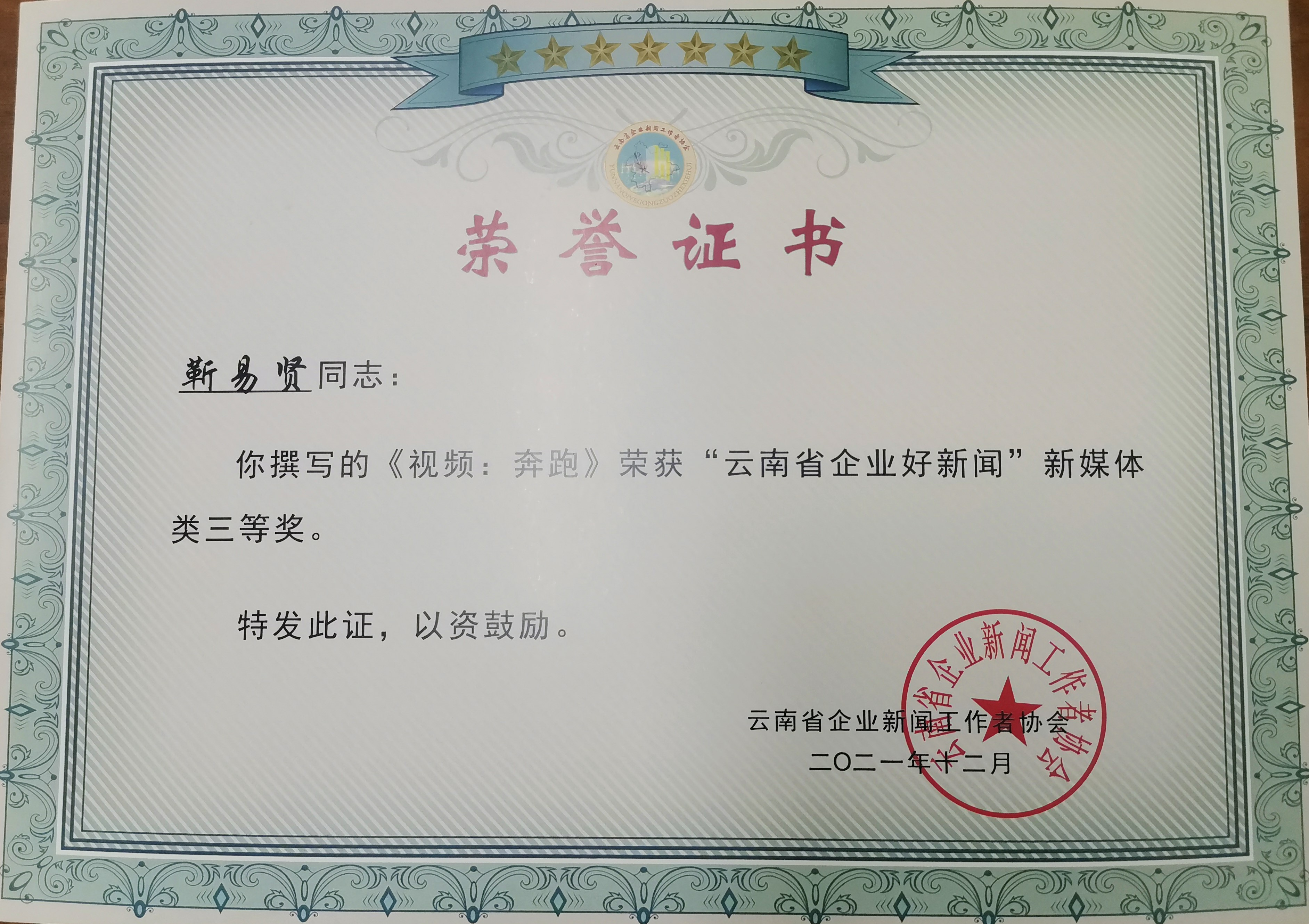 近日,云南省企業新聞工作者協會公布“2020-2021年度好新聞”評選結果,公司4名職工獲獎。其中,第三直管部黨支部書記李梟獲新媒體類二等獎,公司女工主任、第三項目部工會主席靳易賢獲新媒體類三等獎,黨委工作部職工謝超群、邵珊分別獲評論(言論)類、通訊類三等獎。