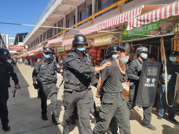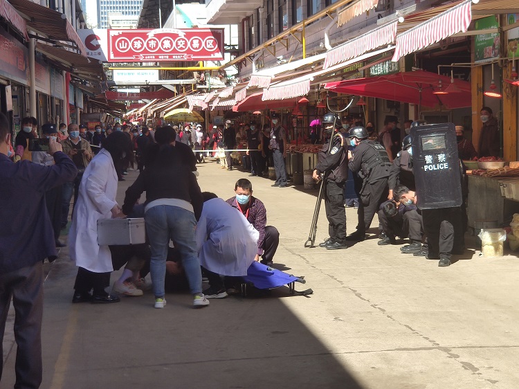 下午2點(diǎn)演練正式開始。一名“歹徒”持刀在1道A棟A-3海鮮水產(chǎn)店門口砍傷一名商戶,值班保安迅速趕到案發(fā)現(xiàn)場(chǎng)處理并上報(bào)市場(chǎng)當(dāng)班領(lǐng)導(dǎo),為遏制事態(tài)的進(jìn)一步發(fā)展,市場(chǎng)隨即啟動(dòng)反恐應(yīng)急預(yù)案。安保人員拿起電警棍進(jìn)行阻攔,并與歹徒周旋、勸告;其他工作人員在第一時(shí)間做好了游客疏散工作,并迅速形成一支強(qiáng)有力的反恐力量,安保人員用鋼叉叉住嫌疑人的腰部、腿部,迅速將其控制,利用盾牌、甩棍等防暴器械默契配合,成功將該男子制伏,有效避免了市場(chǎng)后續(xù)人員傷亡事件的發(fā)生。隨后救護(hù)組接到通知趕往現(xiàn)場(chǎng)迅速開展急救處理,整個(gè)演練過(guò)程緊張有序,疏散和救援有條不紊。