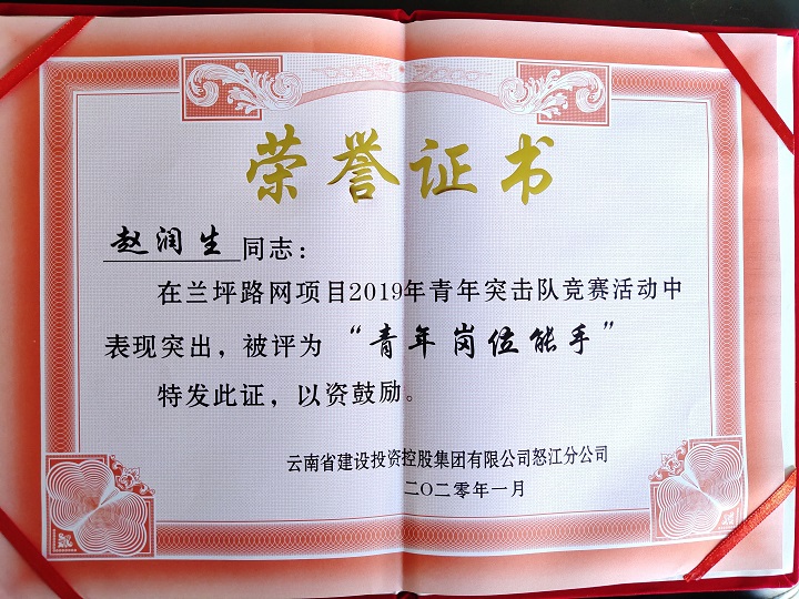 1月12日,在怒江蘭坪路網總承包項目經理部召開的表彰大會上,公司路橋市政直管部維通公路第四合同段“熱火”青年突擊隊獲得蘭坪路網項目2019年青年突擊隊競賽活動“優秀青年突擊隊”榮譽稱號,公司職工趙潤生榮獲“青年崗位能手”。