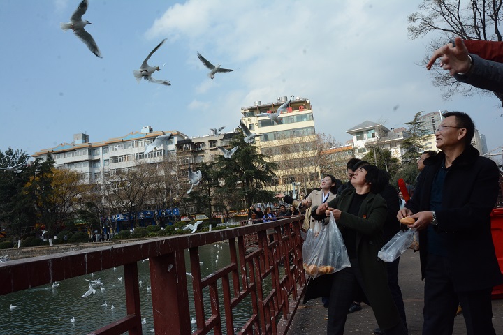 黨員們來到環西橋秋園拿出食物款待空中蹁躚起舞的海鷗,大家開心地一邊拍照一邊喂海鷗,近距離的和海鷗接觸,人鷗相親,成為河畔一道美麗的風景線,為冬天的春城增添了一份溫暖。