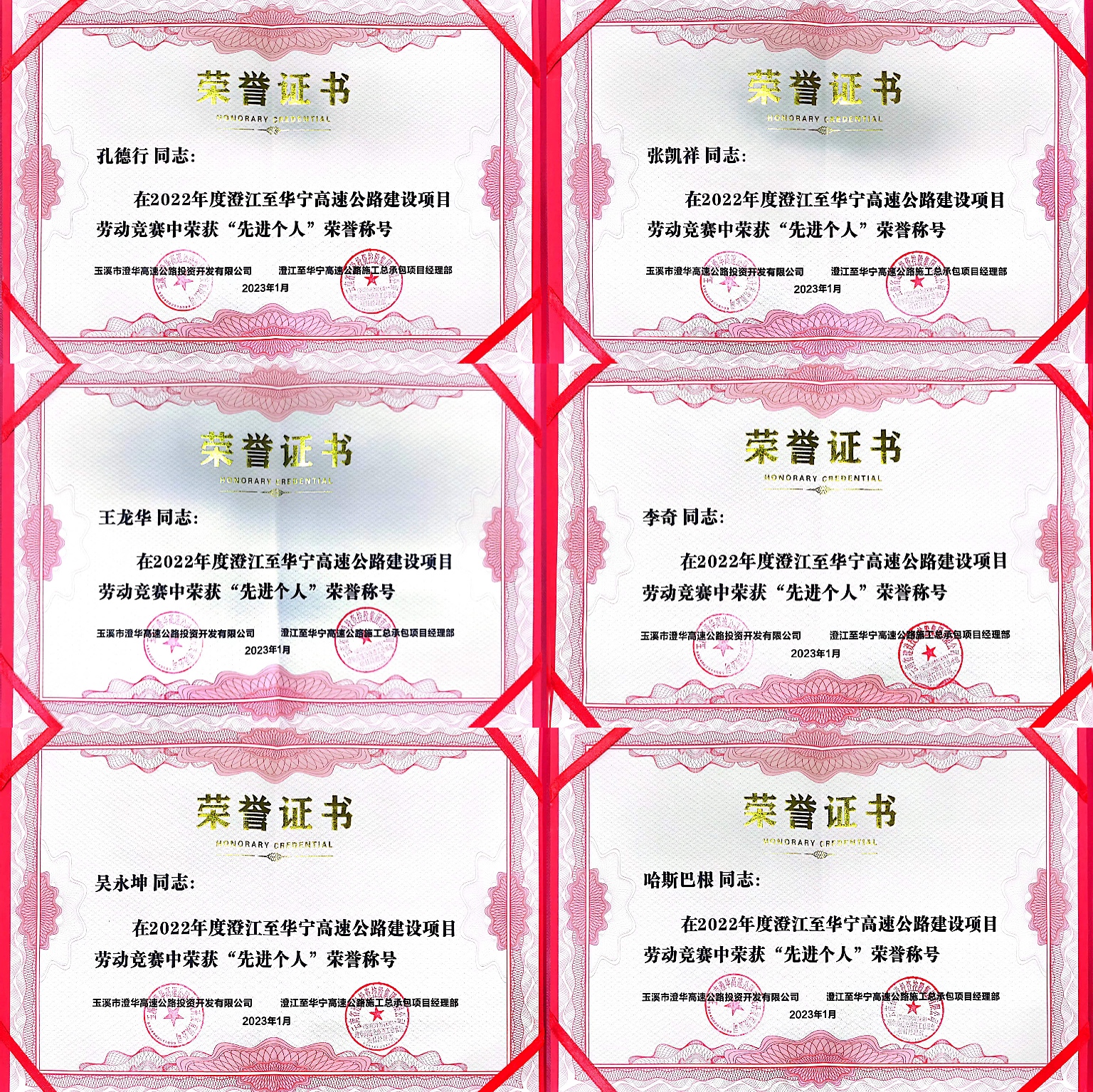 近日,由公司第五直管項目部承建的澄華高速土建九、十分部項目在云南省澄江至華寧高速公路項目“能通全通”“互聯互通”工程勞動競賽中榮獲“先進集體”榮譽稱號,項目管理人員“孔德行、李奇、張凱祥、哈斯巴根、吳永坤、王龍華”6人榮獲“先進個人”稱號。