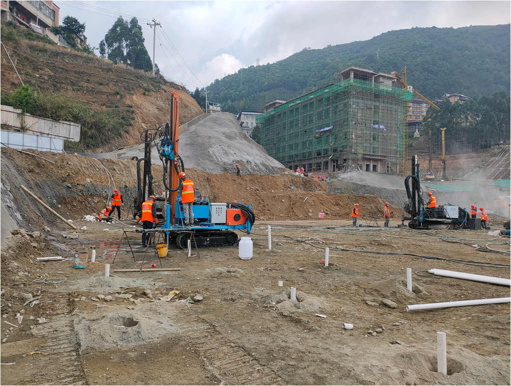 順利完成基坑土方開挖和邊坡支護后,還來不及高興,又一個新的難點挑戰擺在了項目管理人員面前,由于綠春人民醫院遷建地址以前是一處峽谷地形,地基土為填土深度超40m的欠固結土,固結時間僅為8年,未經加固處理的填土地基后期沉降會對樁基造成負摩擦力影響,使樁基礎加速沉降,對建好的建筑危害極大。為此,直管部緊急聯合設計單位、勘察單位的專家們共同商議,從強夯法到高壓旋噴注漿法,先后組織五方責任主體召開項目協調會、專家咨詢會、專題會7次。前期進行了“夯擊成孔—孔內分段夯實碎石樁”工藝試驗,但是對周圍的震動影響太大,后期確定采用“高壓旋噴注漿”工藝對填土地基進行處理,切實解決了工程項目填土沉降的問題。