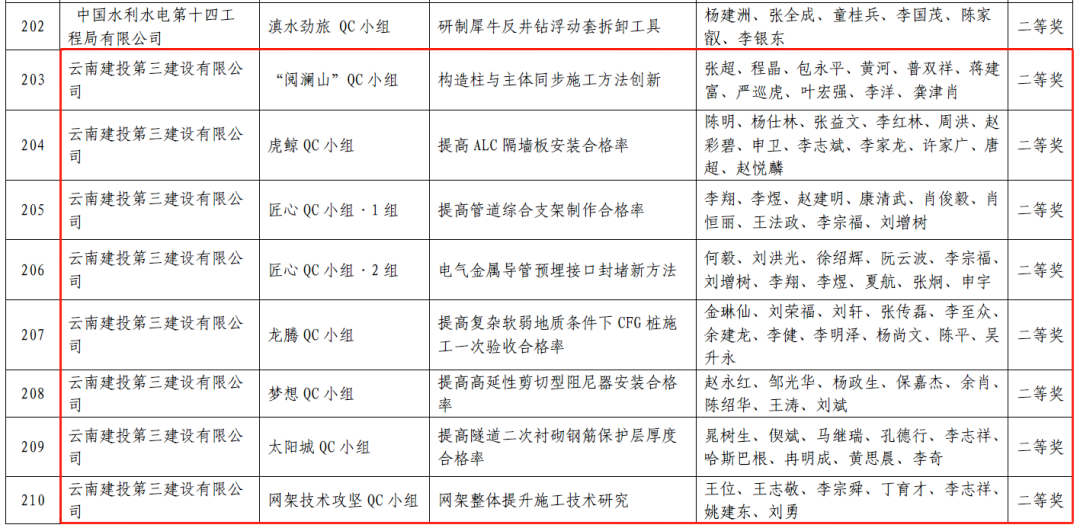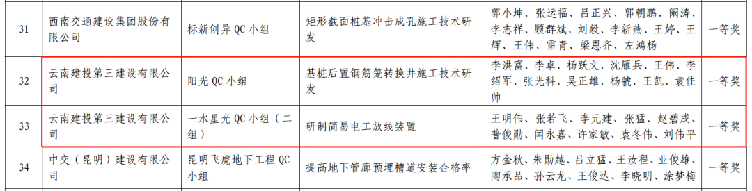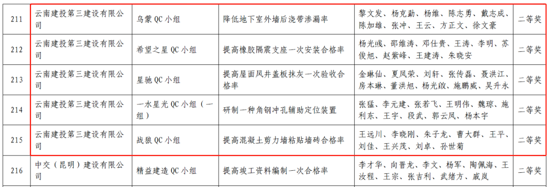 其中,榮獲中國建筑協會優秀QC成果1項(二等獎1項)、榮獲云南省建筑業協會優秀QC成果16項(一等獎2項、二等獎14項)、榮獲云南省市政工程協會優秀QC成果1項(二等獎1項)。
