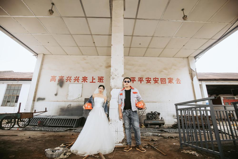 新郎身穿工作服,手拿安全帽,旁邊的新娘一襲白紗,同樣手拿安全帽……婚紗照中的新郎叫許智強,是三公司嵩明楊林滇中保障房項目的主工長。說起為什么會穿著工作服到工地拍攝婚紗照,靦腆的許志強這樣說:“身為建投男兒,工作在一線,每天都在和鋼筋、模板和砼打交道,因此想把這些元素融入自己的結婚照里面。一來自己干的是這行,可以把咱建投...