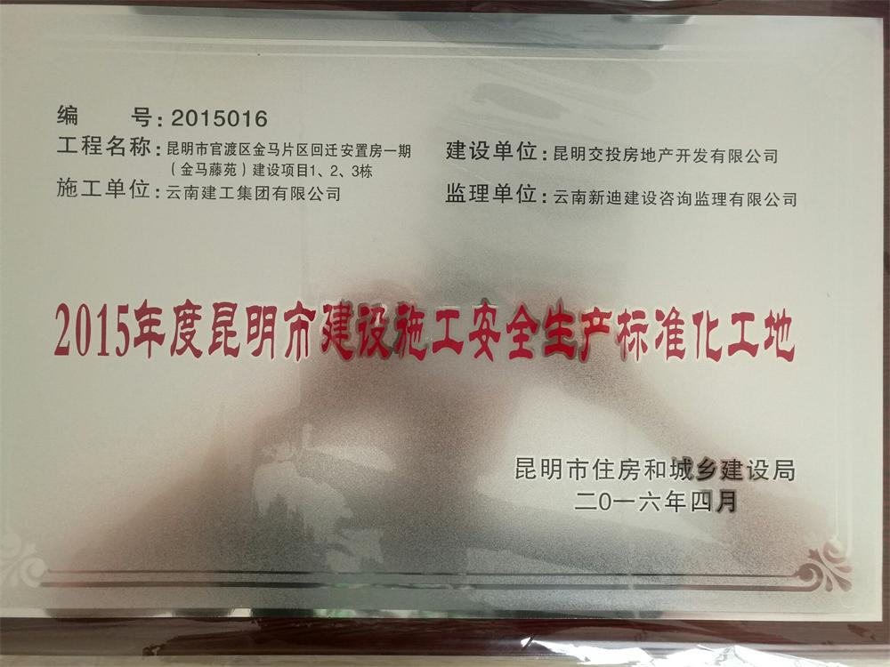十五直管部金馬騰苑項目獲“2015年昆明市建設施工安全生產標準化工地”稱號