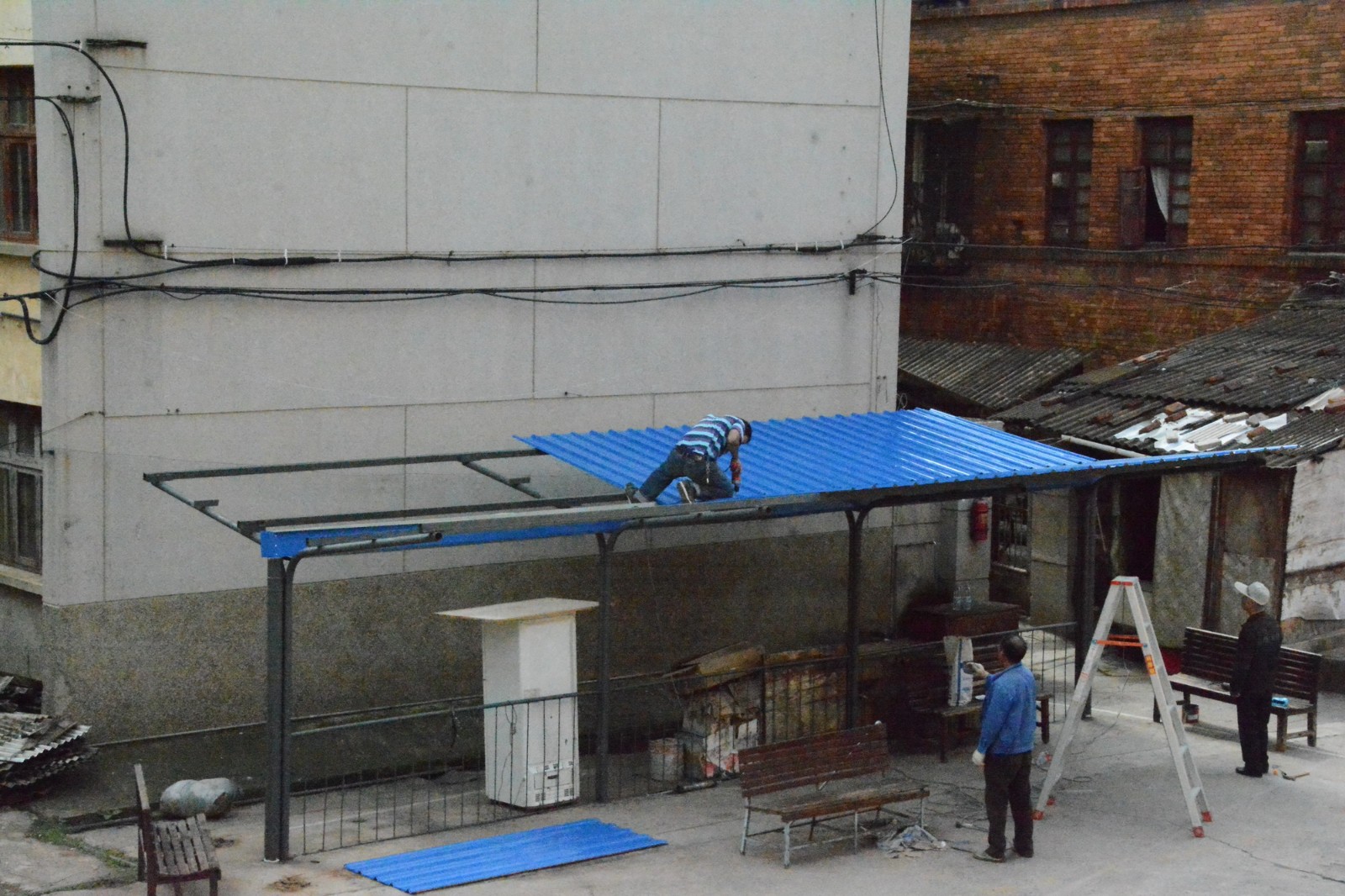 ??8月14日,針對老公司大院內雨棚長年暴露在戶外,已經破損漏雨的問題,六直管部工會組織人員進行了維修,方便院內職工與退休老職工休息乘涼。??本次維修雨棚更換了腐爛漏雨的屋頂,采用新型材料彩鋼瓦,更換了雨水排水管,配置了兩排椅子,可以休息乘涼的人更多了。老公司大院內退休職工很多,大家每天都喜歡到雨棚下面休息話家常,或者...
